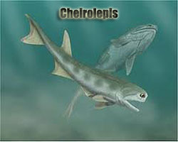 Its streamlined body was encased in a heavy coat of small, rectangular scales, arranged in diagonal rows just like those of the spiny sharks.A row of large scales stiffened the top side of the tail's elongated upper lobe. These scales were a unique feature of all early ray-finned fishes.The upturned tail tended to drive the fish downward in the water. So to counteract this, the paired pectoral and pelvic fins on the underside functioned as hydrofoils, elevating the body at the front. Stability was provided by the large dorsal and anal fins.