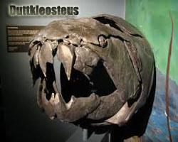 The smooth, scaleless body and the long, eel-like tail.The jointed neck and hinged body shields endowed Dunkleosteus with a slow, powerful bite.
