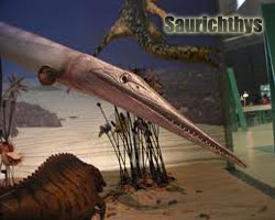 The extended, thin body of this clean water palaeoniscid is redolent of that of the modern crest. Similarly, its dorsal and anal fins were placed well back on the body, near the equal-lobed tail. The regular placing of its fins, together with a great decrease in its bony coat of scales, also made Saurichthys a powerful swimmer